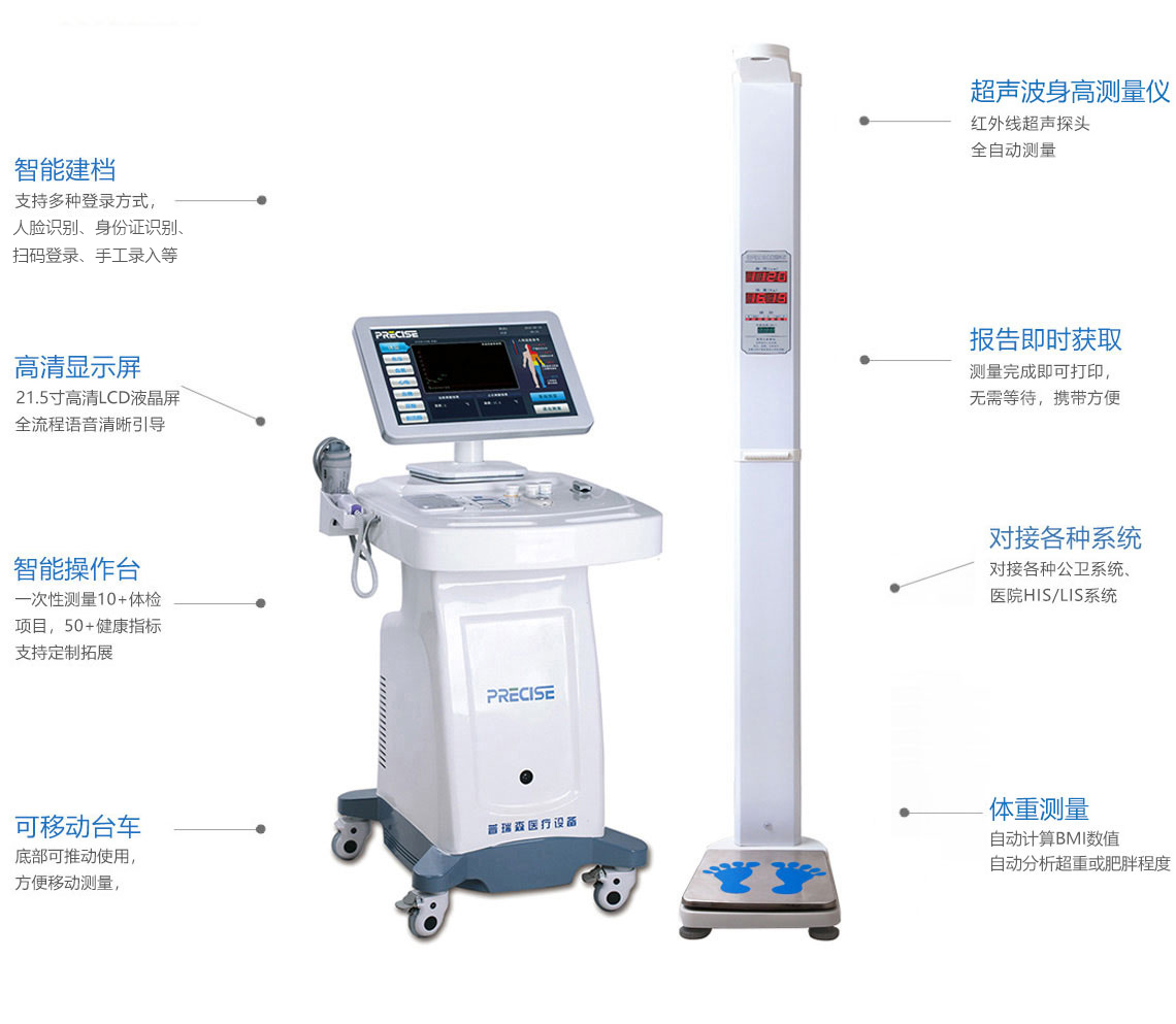 标配功能:身高、体重、BMI、体温、血压、脉率、血氧、血糖、尿酸、胆固醇、腰围、臀围、心电、中医、心理。