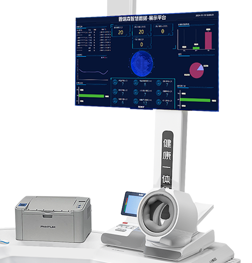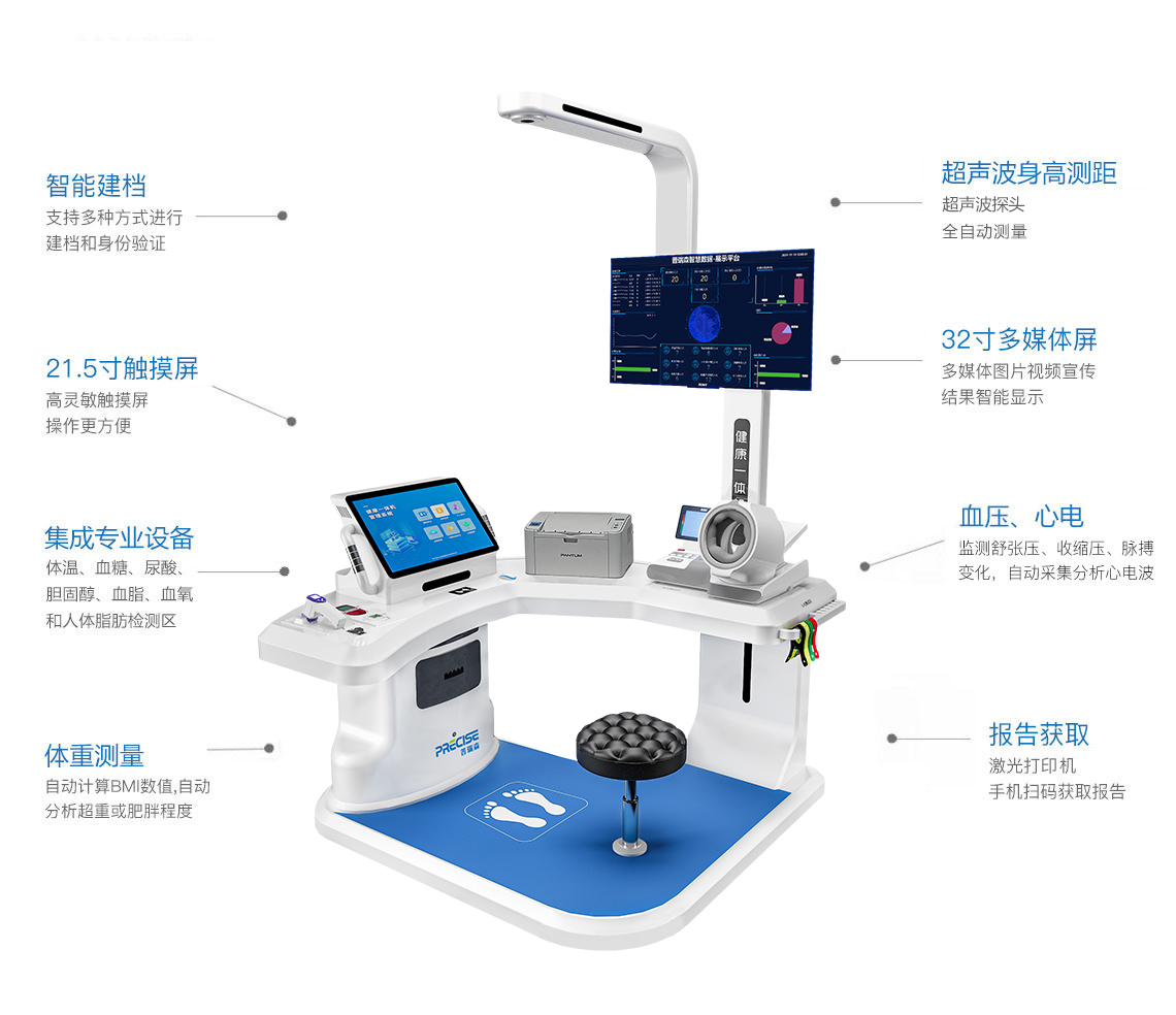 标配功能:身高、体重、BMI、体温、血压、脉率、人体脂肪、血氧、血糖、尿酸、胆固醇、血脂四项、腰围、臀围、心电、视力、色盲、