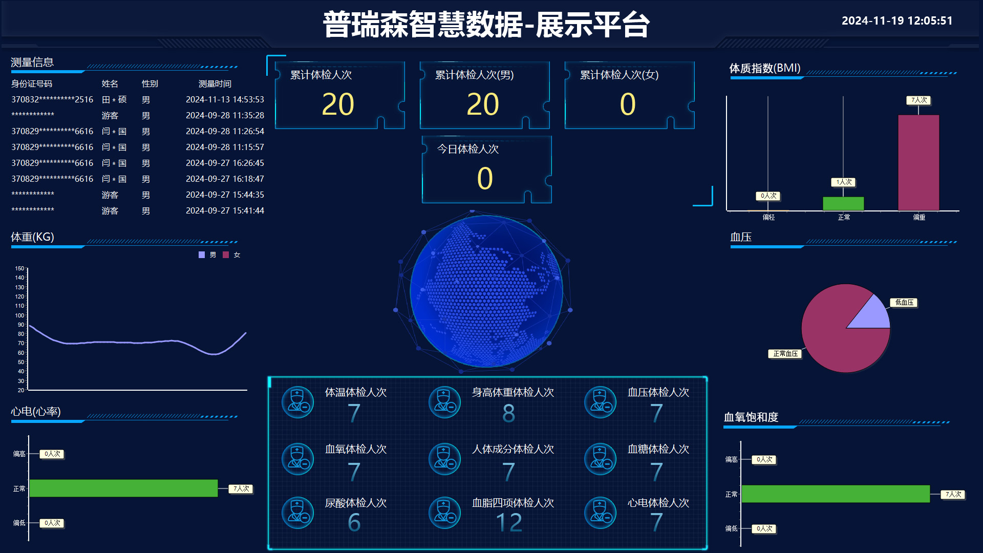 平台包括多个模块,提供详细的体检人次统计、个体测量数据、以及健康状况的可视化分析,帮助个人和企业全面掌握体检动态、健康趋势与风险预警